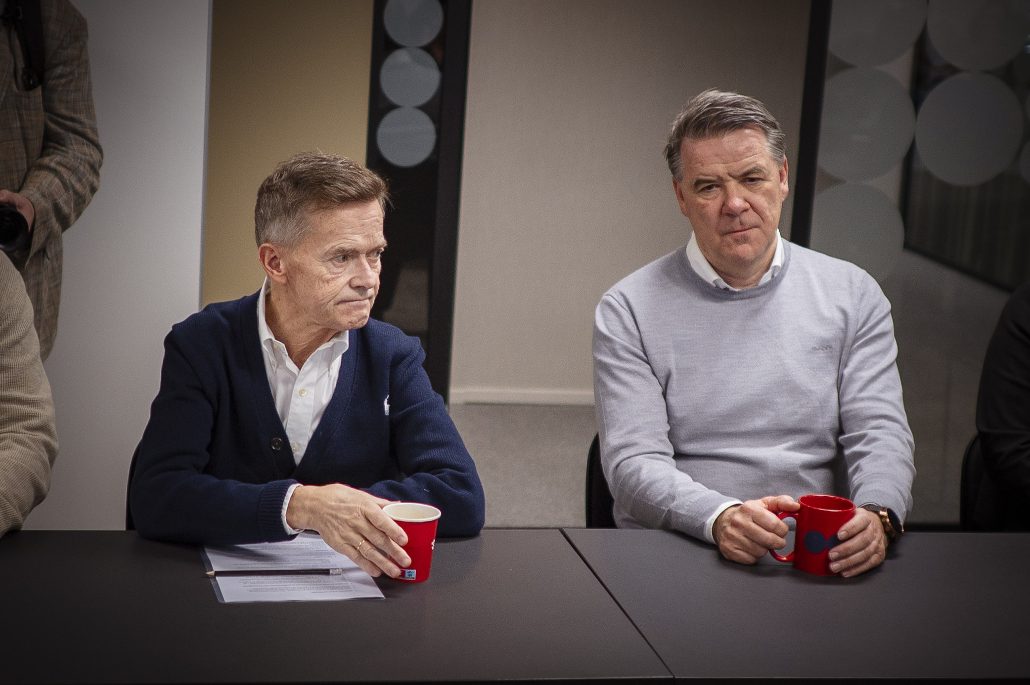 ARBEIDSGIVERNE: På andre siden av bordet leder Jon Stordrange, NHO og Ole Engebret Haugen, VY forhandlingene for arbeidsgiverne.